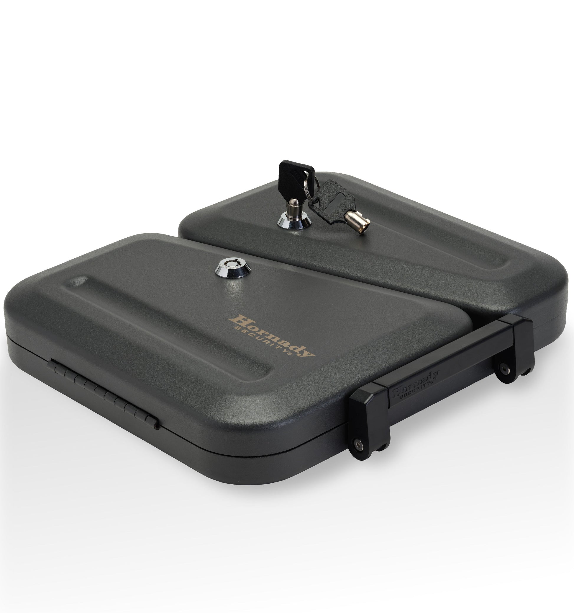 - Durable and Sturdy - This Hornady hand gun safe is made from 16 gauge steel housing to protect against pry attempts. Includes a heavy-duty 1500 lb. steel lock-down cable that attaches the safe to any stationary object, including a vehicle seat or heavy piece of furniture.